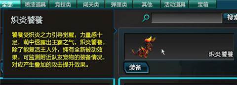 炽焰饕餮,饕餮受炽焰之力引导觉醒,力量感十足,萌萌哒之中透露出王霸之气(诶?)。除了能够复活主人之外,饕餮新增了全新的被动效果,可以检测附近队友宠物的装备(持有)情况,对应产生能够叠加的攻击提升效果。这段话是我在测试之后重新翻译的宠物说明,诶嘿嘿……