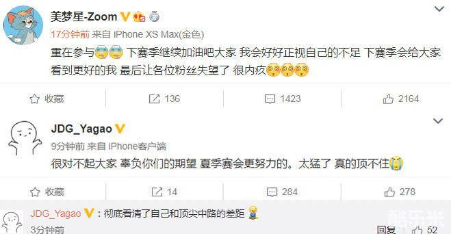 赛后JDG队员发布微博,上单Zoom已经被打晕了,只能表示:“重在参与!”Zoom是TheShy的终极粉丝,第三场比赛掏出线上强势的杰斯,却被TheShy吸血鬼反压了二十多刀,甘拜下风。而中单牙膏则有些情绪低落,发微博向观众道歉,表示自己辜负了粉丝的期待,IG太猛了,他真的顶不住!后来牙膏还在评论区补充道:“彻底看清了自己与顶级中路的差距!”