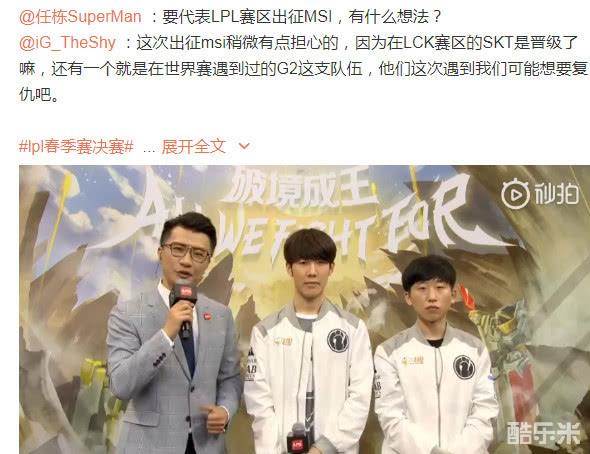 IG战队打出LPL史上最轻松的一场BO5决赛,TheShy估计得占了一半功劳,连解说米勒都在直言TheShy是世界第一上单。不过TheShy本人却很谦逊,在赛后采访中主持人任栋提问他对MSI的看法,TheShy说道:“出征MSI有点担心,因为LCK赛区的SKT晋级了,也担心G2战队遇到我们的时候想要复仇!”