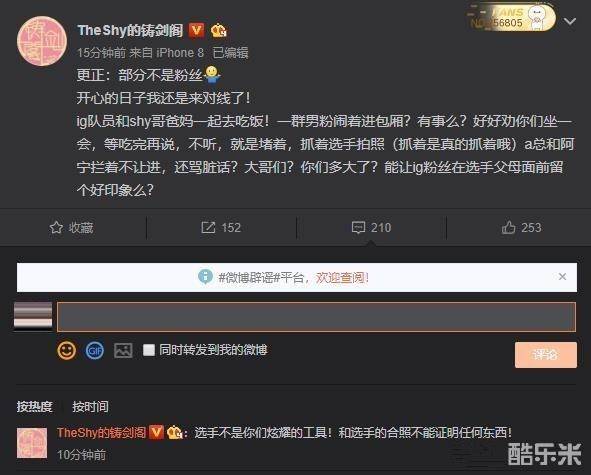 随后IG上单Theshy的影院站负责人简述了一下事情的经过,IG队员和Theshy的爸妈一起去吃饭,突然有一群男粉闹着要进包厢,IG这边劝他们等一下,吃完再说,但是他们不仅不听,还抓着选手要合照,A总和领队阿宁拦着不让进,那些人就骂脏话,真的是在选手父母面前,丢了IG粉丝的脸。当然有些人并不是IG的粉丝。选手不应该成为粉丝们炫耀的工具。