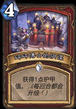 A:卡牌的设计需要考虑很多问题,有时候你需要一张能够改变环境的卡,有时候你需要为未来铺路,而有的设计则是现在看来不怎么样但极具潜力的。比如如果未来我们出一张能够复制手牌的牌,那么砰砰博士的阴谋或许能派上用场,能让你的护甲翻个倍。我们之前也不乏这样最初平平无奇,日后却焕发潜力的设计。