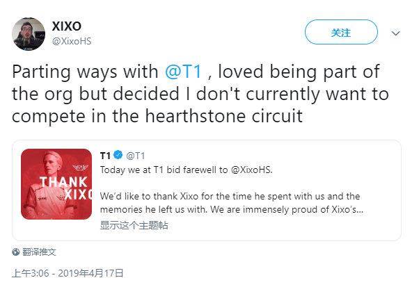 Xixo退出T1战队,表示自己近期不想打炉石系列赛。