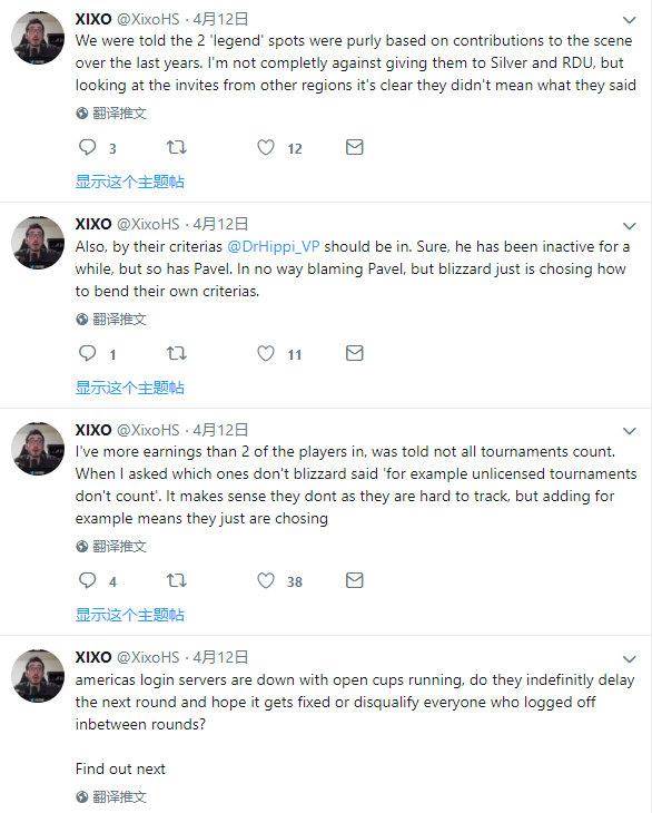 前几天时间,Xixo在Twitter上表达了对大师职业赛的邀请制度的不满:邀请标准不透明,比赛时间长等等。并对大师赛邀请Pavel、Rdu以及Silvername而没邀请自己表示不满,他表示自己职业生涯的奖金数比名单中一些选手都高,当向暴雪询问邀请标准时,官方回应是:“并不是所有比赛都算,例如暴雪未授权的比赛就不算”。这种回复让Xixo认为,暴雪在为钦定的事情找借口。