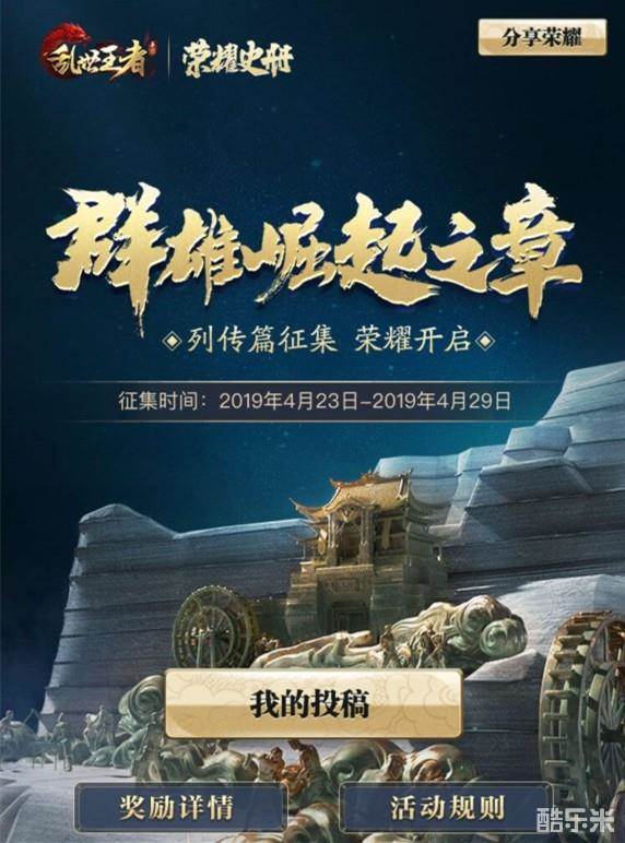 列传篇作为《乱世王者》第二季度最重要的活动,会正式向广大玩家征集与游戏一同度过数载岁月中的点点滴滴。在《乱世王者》里,英雄不问出处,无论是荡气回肠的战争诗篇,亦或是感人肺腑的兄弟情谊,这些专属于玩家的智慧与故事均有机会在《荣耀史册》里留下浓墨重彩的一笔。