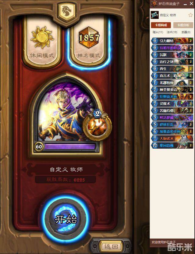 楼主新版本后在国服五级尝试各种非傻子非复活体系的牧师,尝试过以脏为资源补充的复古环牧,最终在国服五级至三级疯狂碰壁,想了很久,没有暗影视界的牧师终究逃不过排序的限制,那么有没有牧师既能保证后期致胜手段,又能过到想要的牌不再怀念暗影视界呢,最终我发现了这套以大厨诺米+灵媒术*2为终结手段,北郡加基森为过牌核心的卡组。