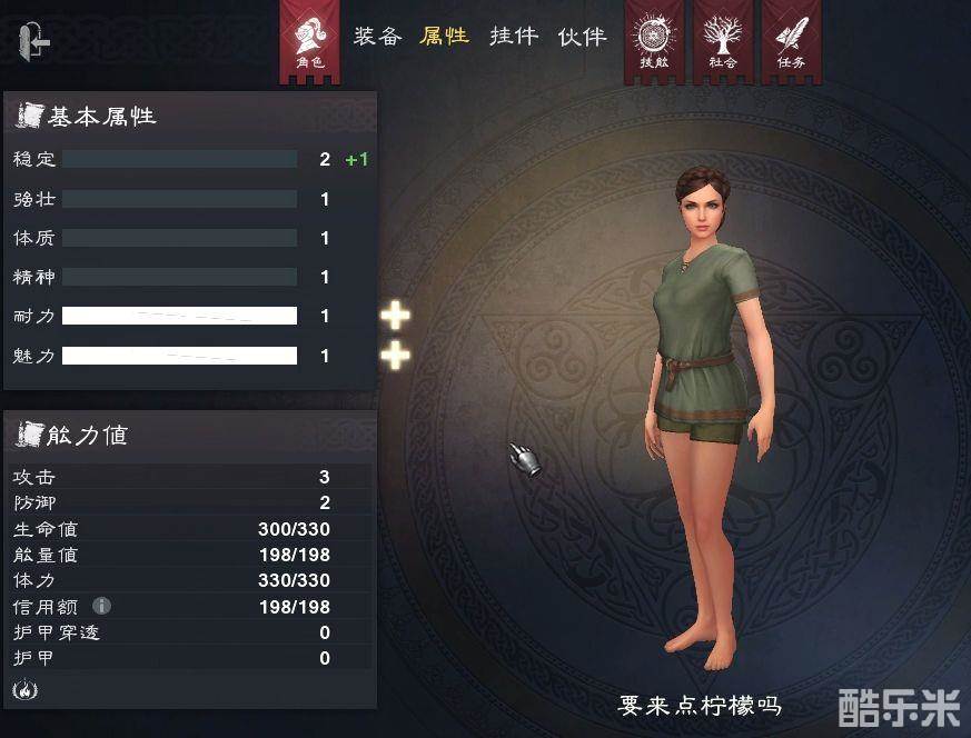 在这里你可以看到四个大分类:角色、技能、社会和任务