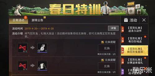 玩家可以通过每天累计登陆5分钟,每天累计登陆10分钟,然后去兑换兔头,在游戏中就可以用起来就可以装饰起来。狂欢大放送,每天都会送两个领结,这个领结就可以用来兑换装饰,效果很不错,可以用来修饰,可以用来装饰的最佳道具。