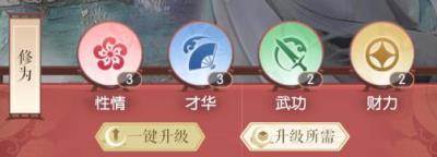 每张因缘卡共有四项修为能够进行升级,可增加情丝等级,并提升性情、才华、武功、财力等属性。点击逐步升级可以将等级最低的修为提升一级,点击一键升级可完成快速升级。天赐卡牌境界突破4次后,可以自由选择修为进行升级。