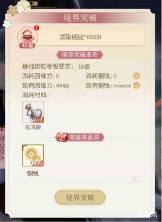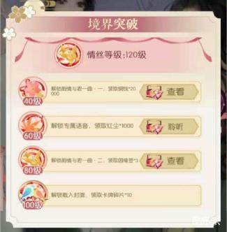 稀世、天赐因缘卡的情丝等级达到上限时,修为无法继续提升,点击此处可进入境界突破界面,提升等级上限,领取奖励。