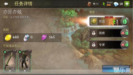 选择任务后进入任务详情界面。游戏中每个关卡分为普通、困难和专家三个难度,难度越高掉落的奖励和战利品越好。