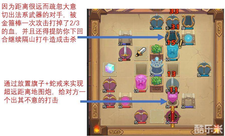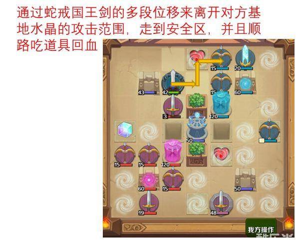 国王剑的特效是在消灭目标之后可以继续移动,这为国王剑提供了非常高的机动性,面对残血或者脆皮小兵可以做到在一回合内移动多次。部分地图一开始就有大量弓箭小兵,可以利用蛇戒国王剑击杀己方小兵来调整位置(调整羽毛的角度/躲避威胁/寻找输出位置)。