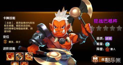 狂战巴格杵在手游传说大陆中是一枚战士爆发型卡牌;品质很高,6格能量才可以上阵,能量条略长,上阵的时候需要考虑时机;