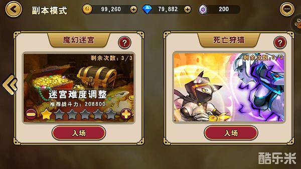 首先介绍一下如何进入死亡狩猎呢,点击主城右侧副本按钮,再往右划看到死亡狩猎点入场就会看到下面2个图,一个初级副本和一个高级副本,分别有4个BOSS,初级副本4个BOSS分别为凯帕斯、娃丝淇、阿木、崔诗特,高级副本4个BOSS分别为娑拉卡、贝提亚斯、司莱、莫腾,大家记得看推荐战斗力哦,要量力而为,不然进去是得不偿失,而且每天没人只有3次进入的机会,千万不要浪费挑战机会。