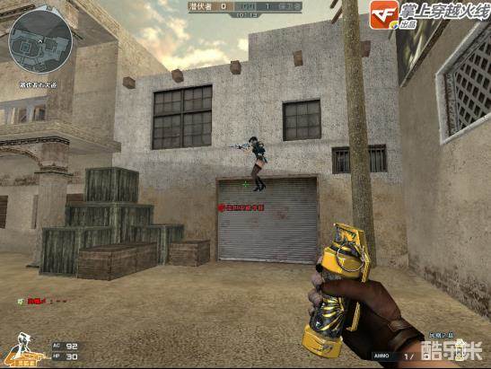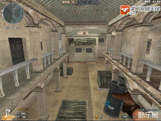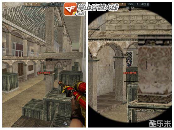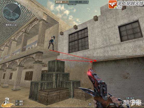 架点方法也很简单,按照图示箭头,采用后跳,按空格+SD,或者面对着跳(空格+SA,不推荐),架点很容易。还有一个优点是,这个位置位于主二的敌人的视野盲区,我们可以看到他们上半身,而只有当他们走到靠近中厅门的位置时才可以看到我们,所以,我们在阻击主道的敌人的同时,也要留意中厅的敌人。