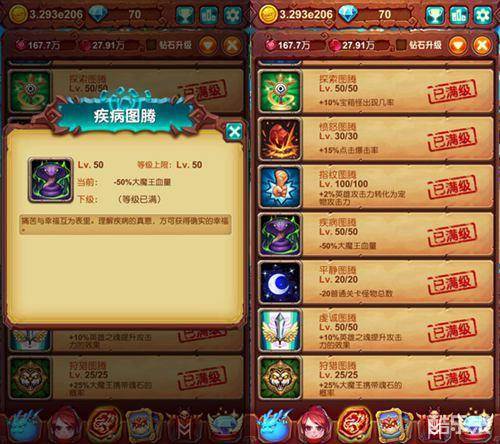 对于勇者们来说,图腾是克制魔王最有效的助力!“疾病图腾”就是其中之一,作为可以将疾病传染给众魔王的强大图腾,一旦拥有了它,则可以直接降低魔王BOSS的生命值!只要将“疾病图腾”升级到满级,可以一次性降低魔王50%的生命值!绝对的魔王杀手,勇者们的最强助力!