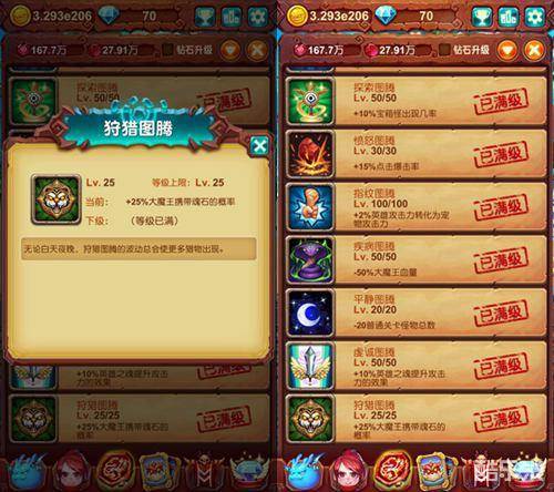 其次“狩猎图腾”也是讨伐魔王的专属图腾!将其携带在身边,可以让我们大大增加我们碰到魔王时,魔王携带魂石的数量,如果说之前挑战 五位魔王才能获得一次魂石,那当拥有一个满级的狩猎图腾时,三位魔王你就可以获得一次魂石,对于后期要频繁进行转生的各位勇士来说,这个图腾的存在无疑是雪中送炭!