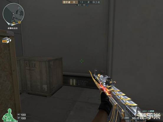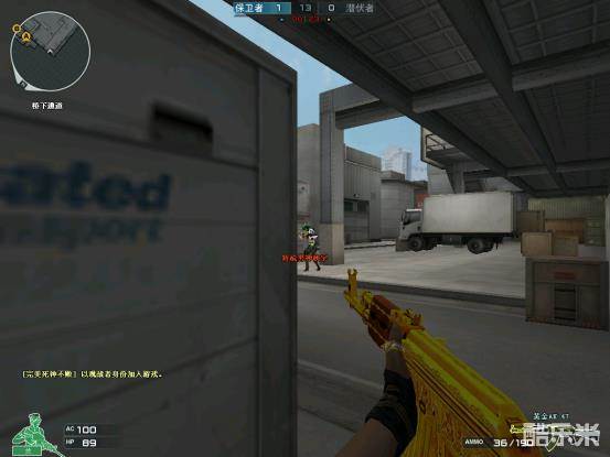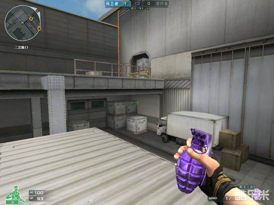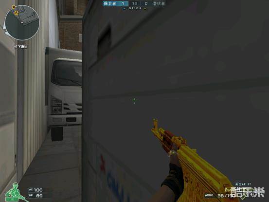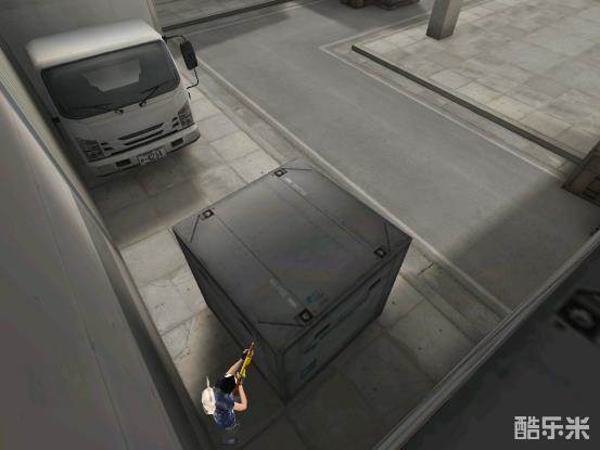 就是这个铁箱子后面啦!是不是很不起眼?小编刚开始玩这张地图的时候都会忽略这个箱子,因为这个箱子太不起眼了,根本不会有人想得到会有人藏在这个铁箱子后,但我们恰恰就是利用了大家的这个心理!当我们作为保卫者时,可以迅速前顶,利用小碎步快速地来到这个铁箱子后,因为这个铁皮箱子足够大,所以我们也不用蹲,不用担心会被敌人看见。