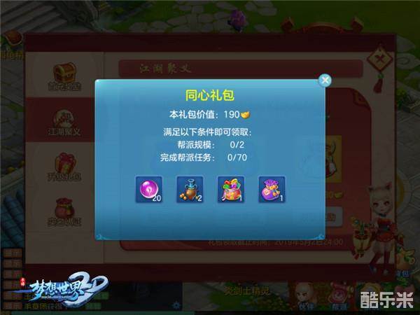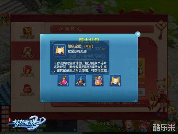 梦想大陆还给各位新少侠准备了江湖聚义礼包三个,满足一定条件均可免费获得,奖励包括宝图碎片、修炼丹、普天同庆、超级宝图等。