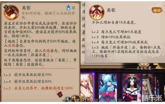 第一个技能,也是她作为辅助式神最为核心的技能——离影。若友方在回合中普攻或者无法动作,该回合结束时有50%纪律让队友拥有80%的抵抗,切记是80%的抵抗,而且在三技能之中她能够让这个技能释放的概率达到100%。