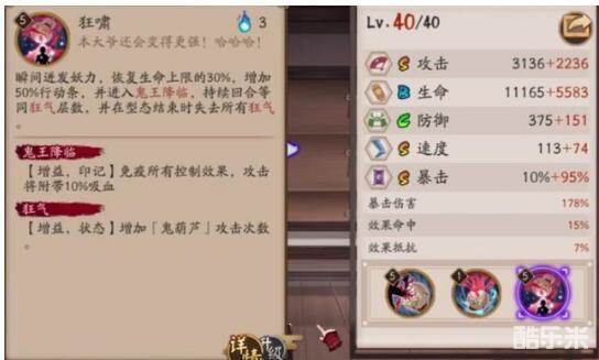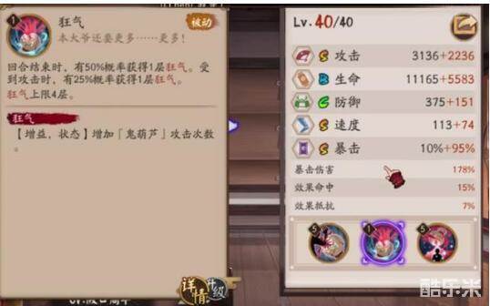 这是作为老一辈SSR式神酒吞童子的技能展示表,非常容易读懂而且一般,就是说被动能够增加普攻次数,大招回血,然后呢?然后就没了!也就是这样酒吞童子彻底没有就业空间,很多时候还不如一张R卡好用,你说作为同类卡池的SSR酒吞童子真的有资格嘛?