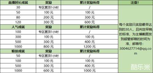 举例:若主播小明为第31个完成300热度直播30小时成就的主播,将无法获得此奖励,只能继续冲击300热度直播50小时的成就。每周会公布一次最新的成就名单。