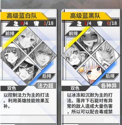 点开右下角的推荐队伍按钮也能,看到有3个推荐配置,英雄均为初始的4个人供玩家参考。