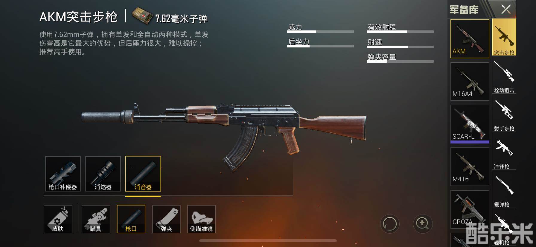 AKM想必大家再熟悉不过了,大神专用步枪,威力大,后坐力也大。因为AKM本身只能配备枪口和弹夹,不能装备握把来降低其后坐力,所以在抢口的选择上我们就要格外谨慎,枪口无疑是选择步枪的枪口补偿器,只有装备了补偿器才能最大程度上缓解AKM的后坐力以及提升枪械的稳定性,而消音器对于AKM的后坐力上没有任何提升,除非你是一个AKM的大神玩家只用AKM来单点杀敌,不然消音器对于AKM来说非常鸡肋。
