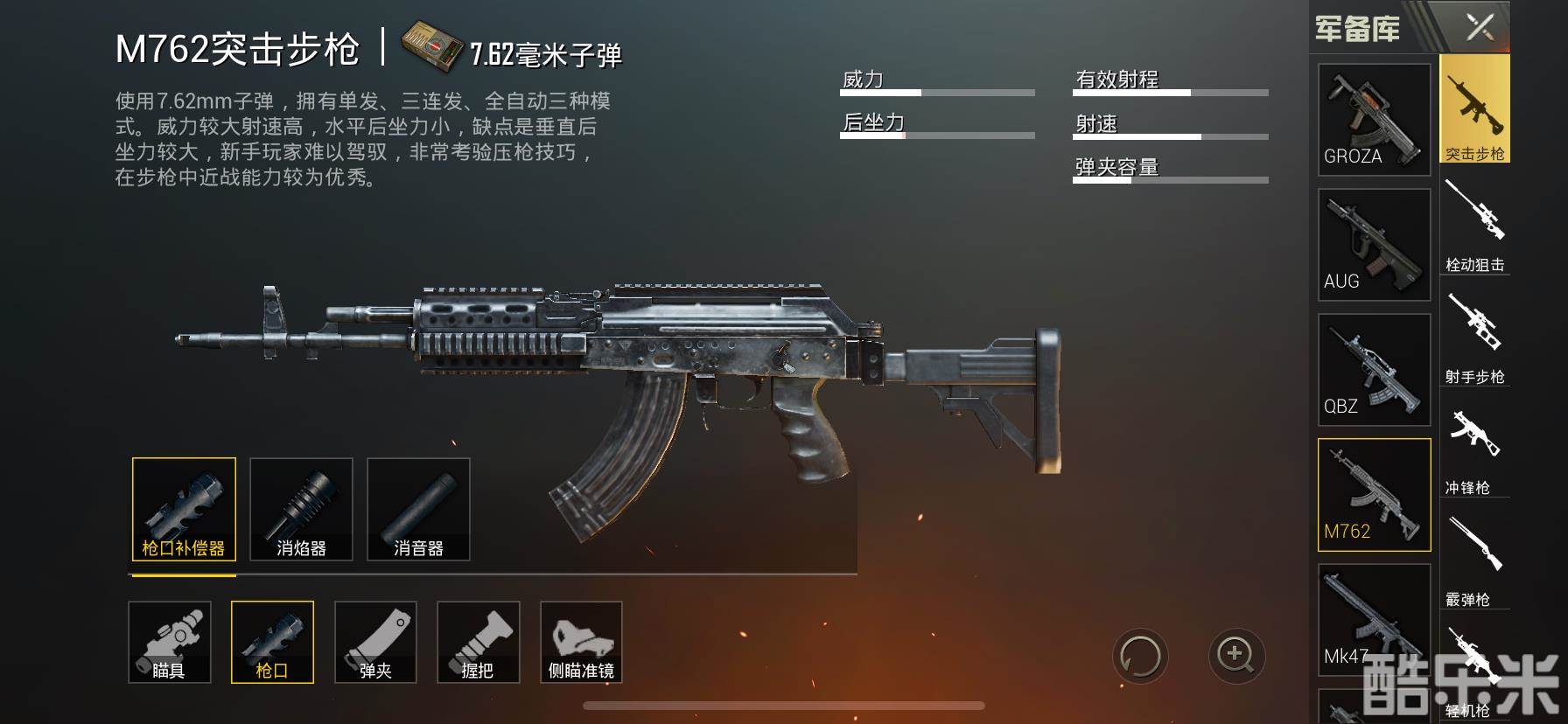 M762这把枪和AKM一样,也是使用7.62子弹的,它的后坐力也是丝毫不弱于AKM,前10发子弹还好,越往后打子弹都要上天了,不得不说在远距离攻击伤上这把枪的表现能力着实是不太优秀的,所以这把枪也是属于近距离作战时使用的,消音器能发挥的作用很小,还不如直接拿着枪对敌人一顿突突。其他的近战步枪也是同理,都最好不装配消音器。