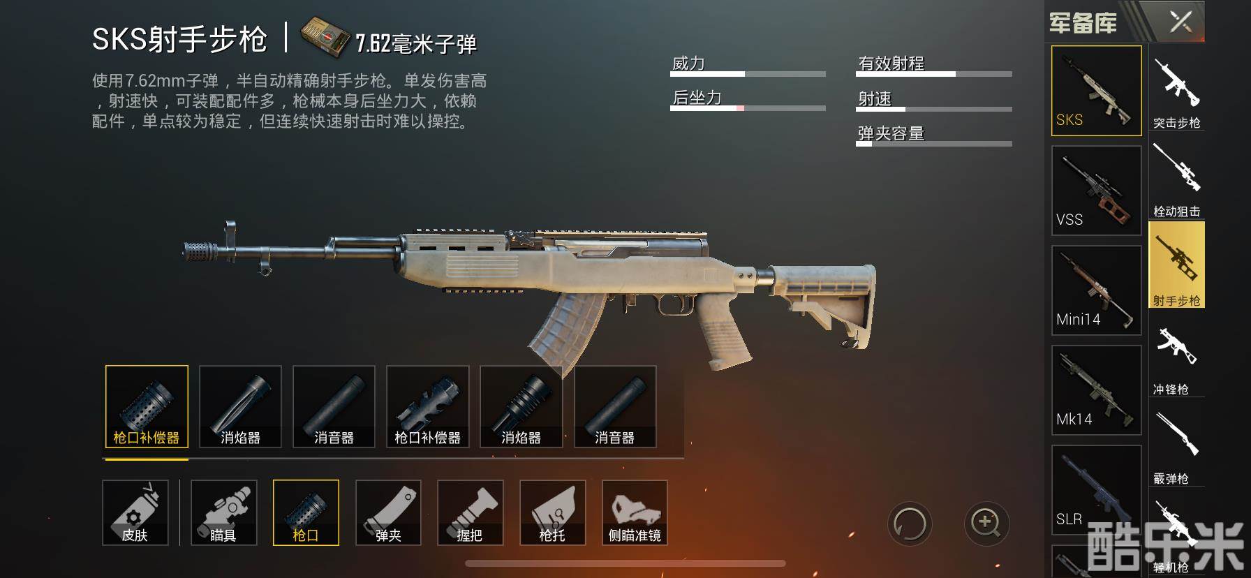 大家一定很好奇,怎么舔包弟把狙击枪也放上来了,狙击枪不是躲在暗处阴人没有声音的属性是最适合的吗?但舔包弟要很遗憾的告诉你,SKS虽然是一把连狙,但它的后坐力仅次于98K。虽然SKS的伤害很高,但连狙都需要快速的击杀敌人,否则很容易乱了节奏,所以需要补偿器来调整手感。当然,如果只是躲在暗处放放阴枪恶心一下对手,SKS还是可以配备消音器的。