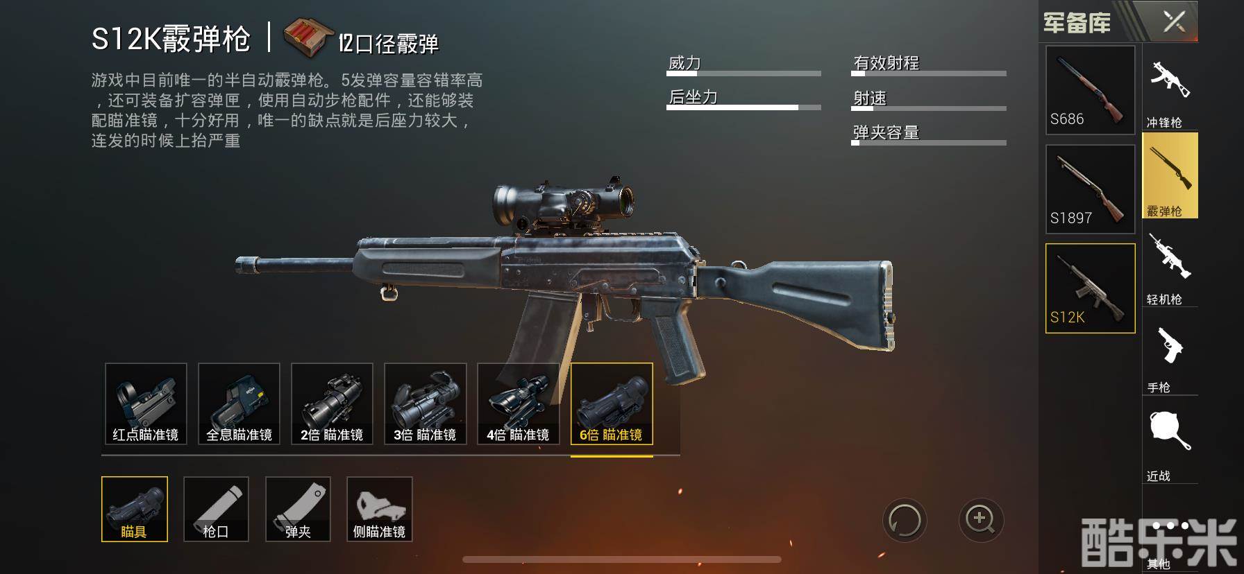 说S12K是一把霰弹枪,但它又能使用步枪的配件,甚至可以使用6倍镜。但很尴尬的是,由于霰弹枪独特的攻击方式,这些配件显得毫无意义...有限的射程决定它只能是一把近战神器,如果说装配枪口补偿器 还能减少后坐力,那装配消音器就有点掩耳盗铃的意思了...所以如果不是怕近距离震聋敌人的耳朵,鸡友们还是不要给它再装消音器了!