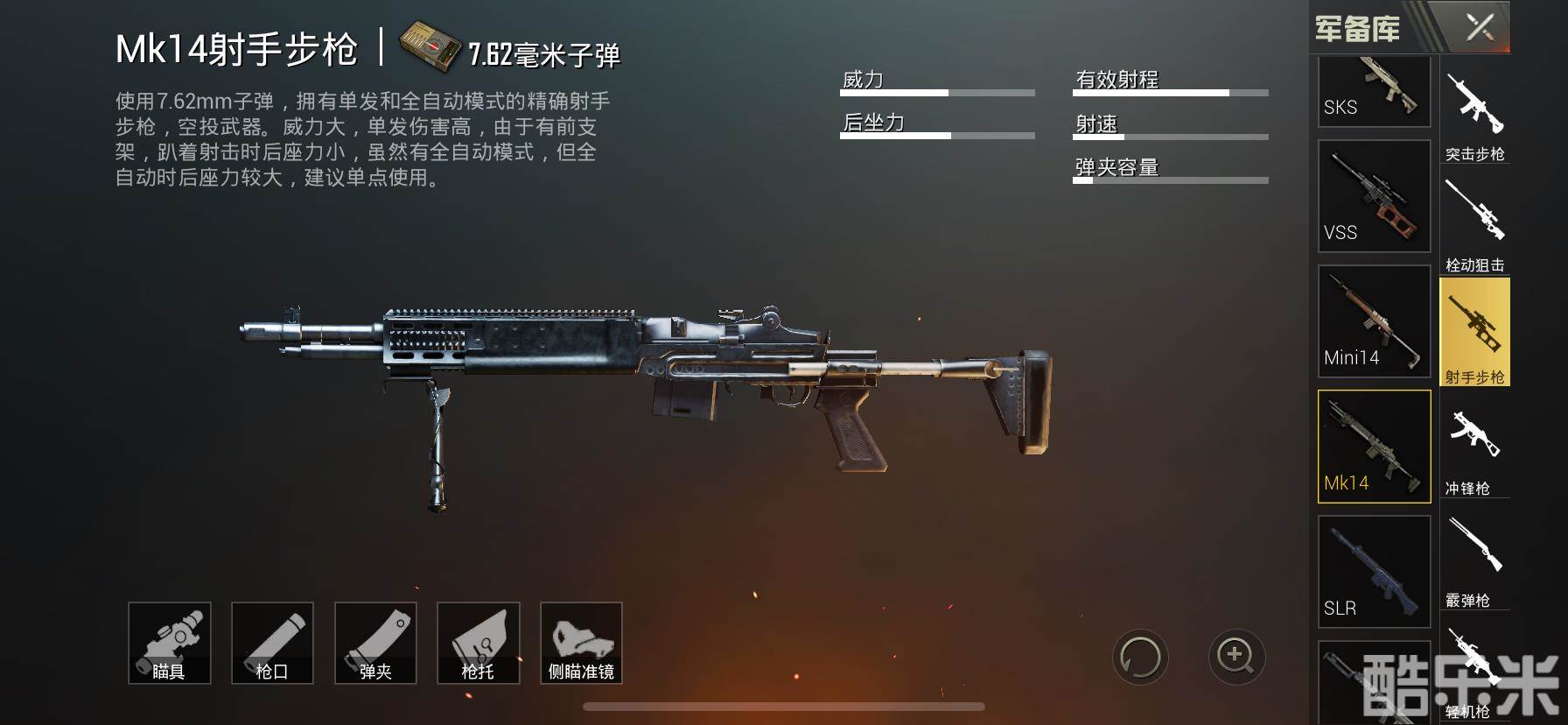 MK14是一把空投枪,玩家一般叫它“妹控”,MK14虽然是一把射手步枪,但可别小看它近战的威力。它拥有狙击的伤害,步枪的射速,作为一把射手步枪它竟然比普通步枪的射速还要高,这时很多玩家都不能容忍的。虽然后坐力高,但在近战中,即使前几枪打不中敌人,也可以及时调整,伤害杠杠的。