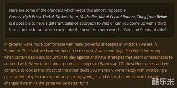 问:我给你说几张卡你看一下——巴内斯、高阶祭司赛卡尔、至暗时刻、空灵、暗金教水晶侍女、深渊魔物,是否可以考虑一下让他们在标准和狂野有不同的效果以此来达到平衡呢?