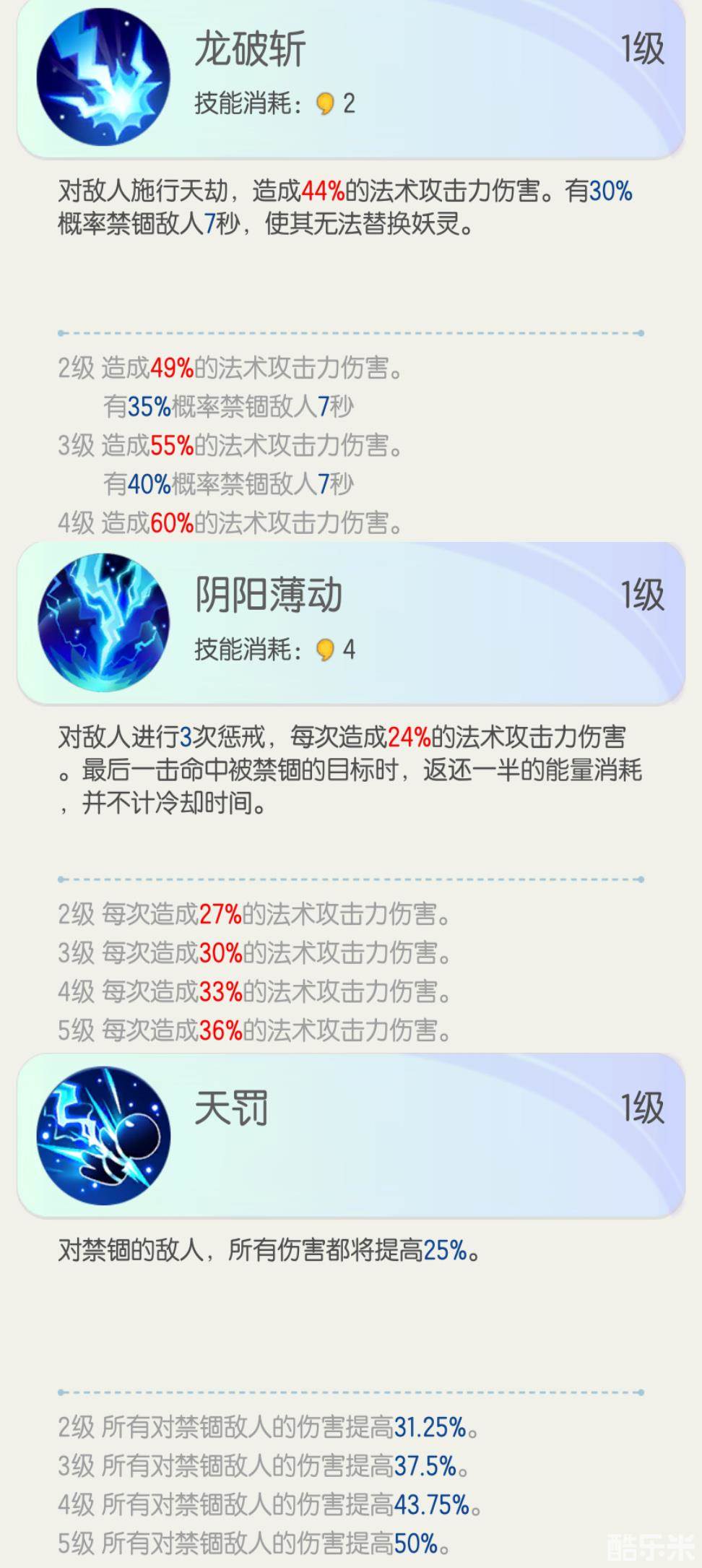 每个技能所带来的攻击伤害也各不相同,一技能龙破斩造成法术伤害,且有30%的概率禁锢敌人长达七秒,使对方暂时无法更换妖灵。