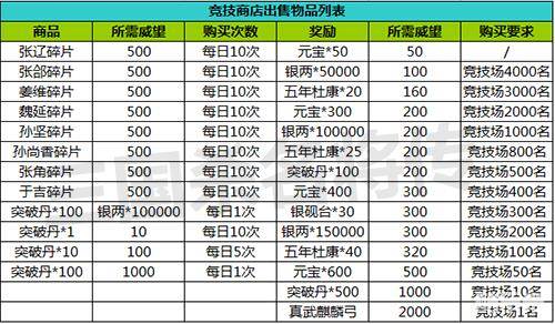 各位主公可使用威望在竞技场商店购买物品如下:
