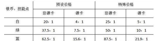 银币与1点技能点的比,比值越小越划算。例如我要升级一个紫卡技能。找到紫-源卡位置,41.7:1,然后对比非源卡各品质比例,发现绿卡和白卡的比例都比紫-源卡低,所以,选择白卡和绿卡来升级会比较划算。