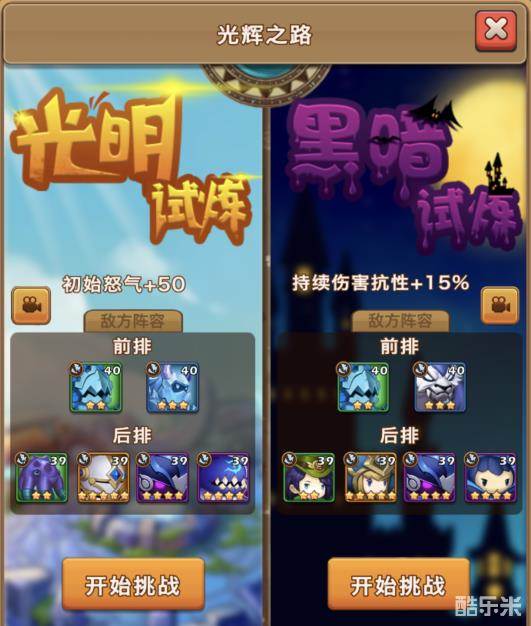 光辉之路在游戏主界面的最顶端,目前需要个人等级达到120级才能开启,点击进入后从第一层开始挑战,每一层有5个小关卡组成。进入关卡后必同时通过光明试炼和黑暗试炼才算通关完成,而且通关光明试炼和黑暗试炼的英雄不能一样,这就意味着需要培养两套阵容来进行挑战,这让光辉之路的闯关更具有挑战性。