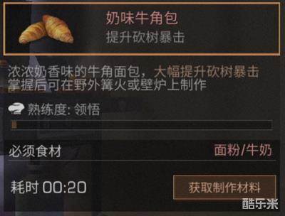 浓浓奶香味的牛角面包,大幅提升砍树暴击;掌握后可在野外篝火或壁炉上制作。