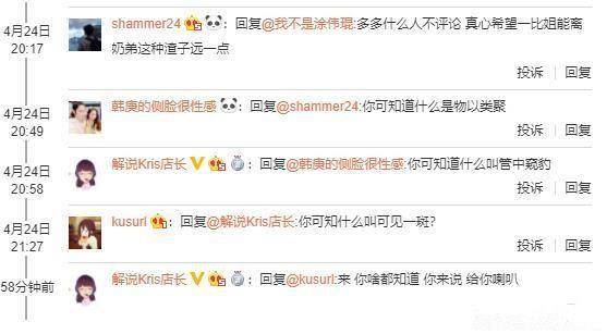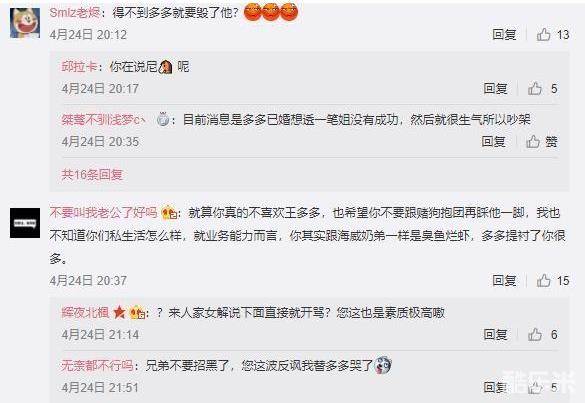 不过之后kris就没有再回应了,因为她的微博中充斥着太多下图中的评论了,比如有人怒斥kris得不到王多多现在就要毁了他?就算你不喜欢王多多,也希望你不要和其他解说抱团踩他,因为就业务能力而言,你和奶弟海威一样都是臭鱼烂虾,因为和王多多搭档解说,他帮你弥补了很多。