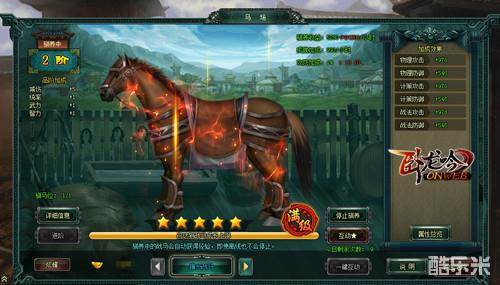 战马是主公不离不弃的伙伴,跟随主公一起成长。战马的星级相当于战马的等级,通过训练战马可以获得经验提升星级,星级越高战马的属性加成也就越高,增幅取决于战马的成长系数。当星星存满后可以进行进阶,每一次进阶可以大幅度提升战马的基础属性,提高成长系数,同时获得一定的等阶加成,如暴击、反伤、武力等加成属性,对所有武将都有用。