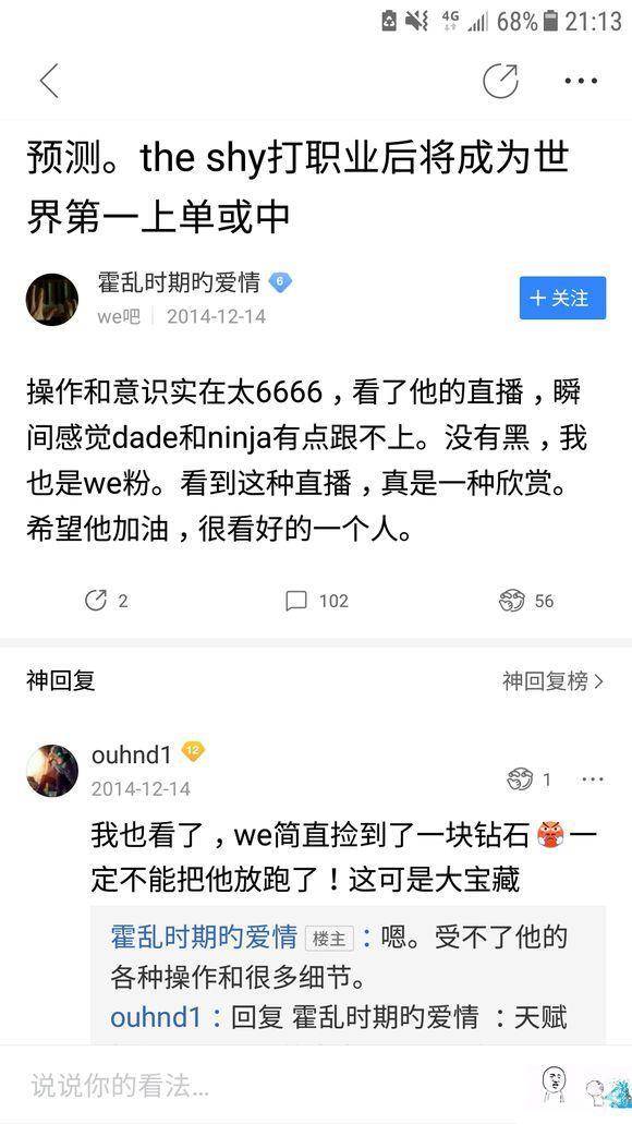 这是在2014年的预测,该网友从theshy在rank中的表现,就大胆的预测他以后将是世界第一上单,这个眼光有点独到啊。现在的theshy是很成功,但你们或许不知道,theshy职业生涯的初期有多么艰辛。