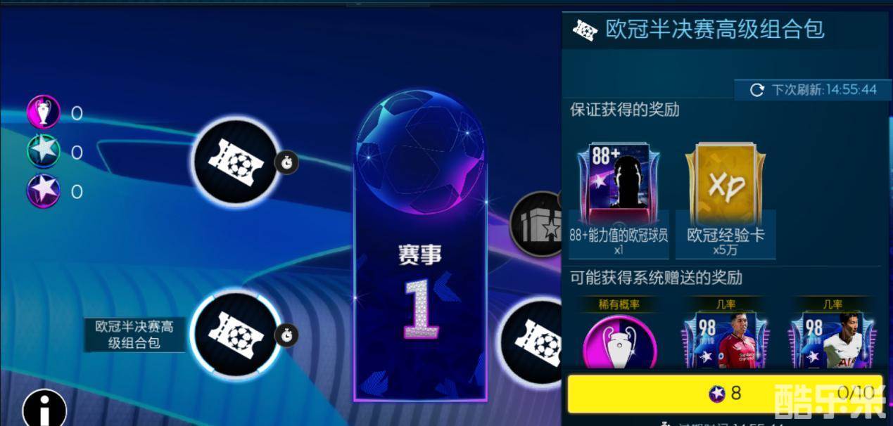 半决赛第一回合章节为兑换和竞猜章节,在本章节里,玩家可以在主章节里获得的欧冠半决赛积分兑换欧冠半决赛组合包,更可以通过组合包内开出的欧冠半决赛高级积分,兑换高级组合包,两种兑换方式都有机会兑换到高能力值欧冠球星!而欧冠半决赛高级组合包更有一定几率获得欧冠赛事积分以及超强力半决赛球星哦!
