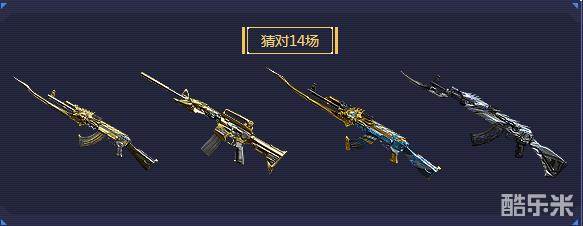 如果你的复活卡与预测正确场数(加上复活卡后猜对的总场数)为14场(全对),那么你将必得永久王者武器、永久英雄武器或永久皮肤。猜对14场奖池如下图,包含大量王者武器、英雄武器、武器皮肤等,并且全部都是永久,百分百获得。精准预测+复活卡机会+一颗热爱CF的心=猜对14场=必得永久王者英雄皮肤。不知道全对的奖池中,你能否获得最想要的呢?