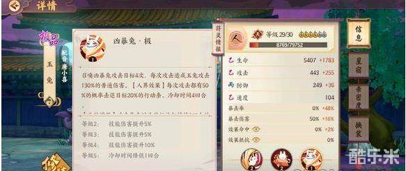 玉兔(一测见过的小可爱,和三测比起来是本次测试新增,研究了半天极品单体决定用她,基础伤害系数130%*4,人界效果可以推条,每次暴击后100%挂一层持续伤害效果,暴击起来打BOSS非常强,在我看来比九尾强,另外二技能的增益驱散和普攻的破防效果都很实用)