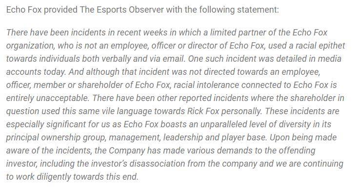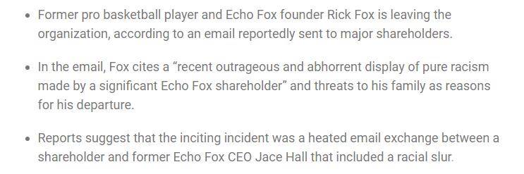 根据Esports Observer的报道,前职业球员以及Echo Fox的创始人Rick Fox将会离职,由于一位Echo Fox股东在工作中表现出的种族歧视行为。根据外网的报道,事件的冲突可能来自于投资Echo Fox的公司 Vision Esports的某位股东多次对Echo Fox前CEO使用种族歧视的语言。因为很多股东都对这样的行为视而不见,Rick Fox无法忍受公司这种氛围选择离职。同时Echo Fox也有发布官方声明印证这一事件,截图如下。