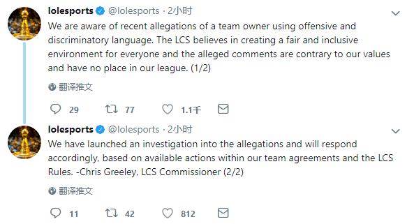 “我们知道最近有人指控一位队伍老板使用攻击性和歧视性语言。LCS 一直想为每个人创造一个公平和包容的环境, 这样的言论违背了我们的价值观, 我们将不会允许这样的事情发生在联盟中。我们已对这些指控展开调查, 并将根据我们的团队协议和LCS的规定作出相应回应。-Chris Greeley, LCS委员”