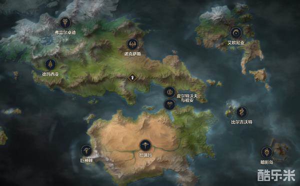 地图上还出现了许多的标示,包括了诺克萨斯、艾欧尼亚、皮城和祖安、巨神峰、恕瑞玛。对比下面现在的联盟宇宙地图,就会发现少了弗雷尔卓德、德玛西亚、比尔吉沃特、暗影岛。其实比尔吉沃特并没有少,只是在下一张地图,但是德玛西亚和弗雷尔卓德确实是没有的。暗影岛压根就没出现他的地图,所以无从判断。