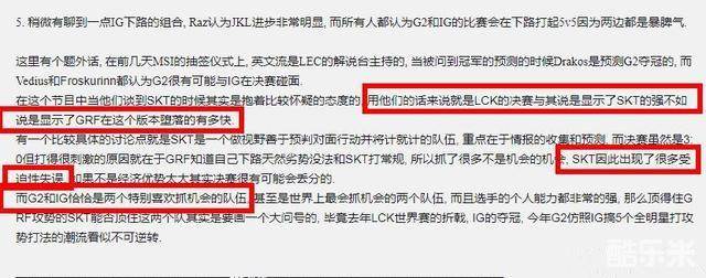 在这个讨论中,他们认为IG非常的强大,肯定能够进入决赛,而决赛的另外一支队伍,他们认为是G2,为什么不是SKT,在他们的言谈中其实是看不起SKT的,认为SKT其实有很多失误,而战胜GRF,并不是显示了SKT的强大,而是显示了GRF在这个版本堕落的有多快,IG和G2都是非常善于抓机会的队伍,在这种顶尖的对抗中,SKT犯的失误只要被抓住,能不能顶住要打一个大大的问号!