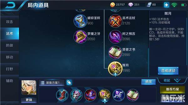 为了最大限度发挥张良的控制能力,在中期应配合队友多游走于战场,相对而言也更加危险。所以此时应尽早出辉月这件装备,不仅具备冷却缩减的加成,更好地发挥强大的控制技能。其唯一主动,还能够有效地保护张良的生命,提高容错率。避免了被敌人集火秒杀,甚至还可以完成反杀。