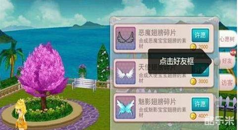 首先我们可以通过两种方式进入。第一个是在大厅选择当日任务,也可以从任务栏点击宝宝进入许愿树页面。这时候我们看到有三个翅膀可以供我们选择。你可以按自己的喜好合成任意的翅膀。点击右侧有好友框就可以进入好友页面。