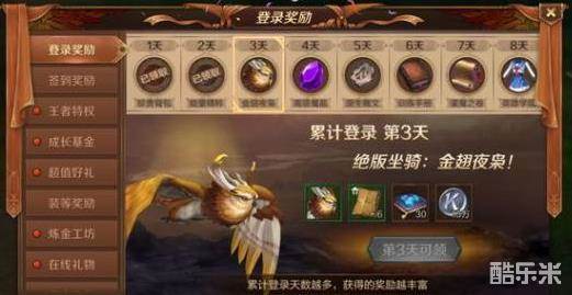 登录奖励包含绒布包、钻石、坐骑、时装、能量精髓、高级魔晶、源生雕文、训练手册、灌魔之卷、佣兵战斗技巧、克朗等诸多好礼。其中,登录3天获绝版坐骑:金翅夜枭,登录8天获绝版时装:英雄学院!